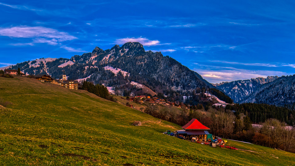 La Presqu’île, son pont et vue des alentours depuis les pâturages sous le village.